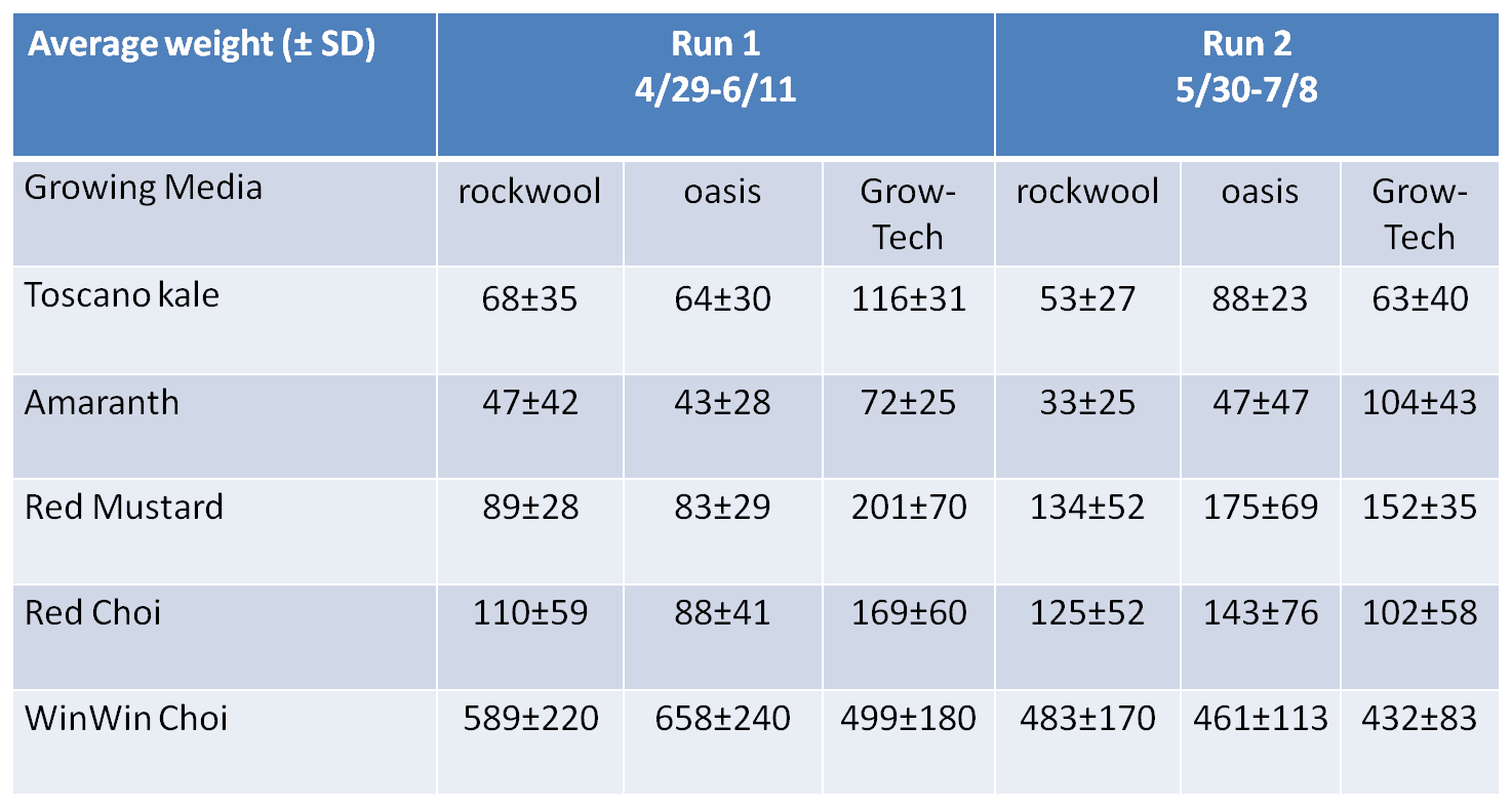 - Thirdly, the impact of our different growing media was not clear in these trials. This is certainly my least favorite point as unclear results frustrate every researcher. In looking at the yield trends between the two runs, the differences (or lack thereof) between rockwool, oasis, and the Grow-Tech cubes were not consistent. In run 1, the peat cubes tended to perform better while that was not seen in run 2. Environmental conditions were reasonably consistent in these two trials, so that is unlikely to be the primary cause for these inconsistencies. I am hesitant to draw too strong a conclusion about this on early trials, but I will say that it may be differences in germination speed, moisture content (and therefore fertility), temperature and the like early in crop growth that led to these variations. We generally deal with pelleted lettuce seed that produces very consistent germination and early growth. Because these Brassica crops are not bred for controlled environment production, their response to small differences in conditions may not be as well understood at this point in time. More focus on the seedling aspect may well be needed.