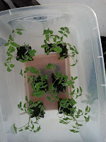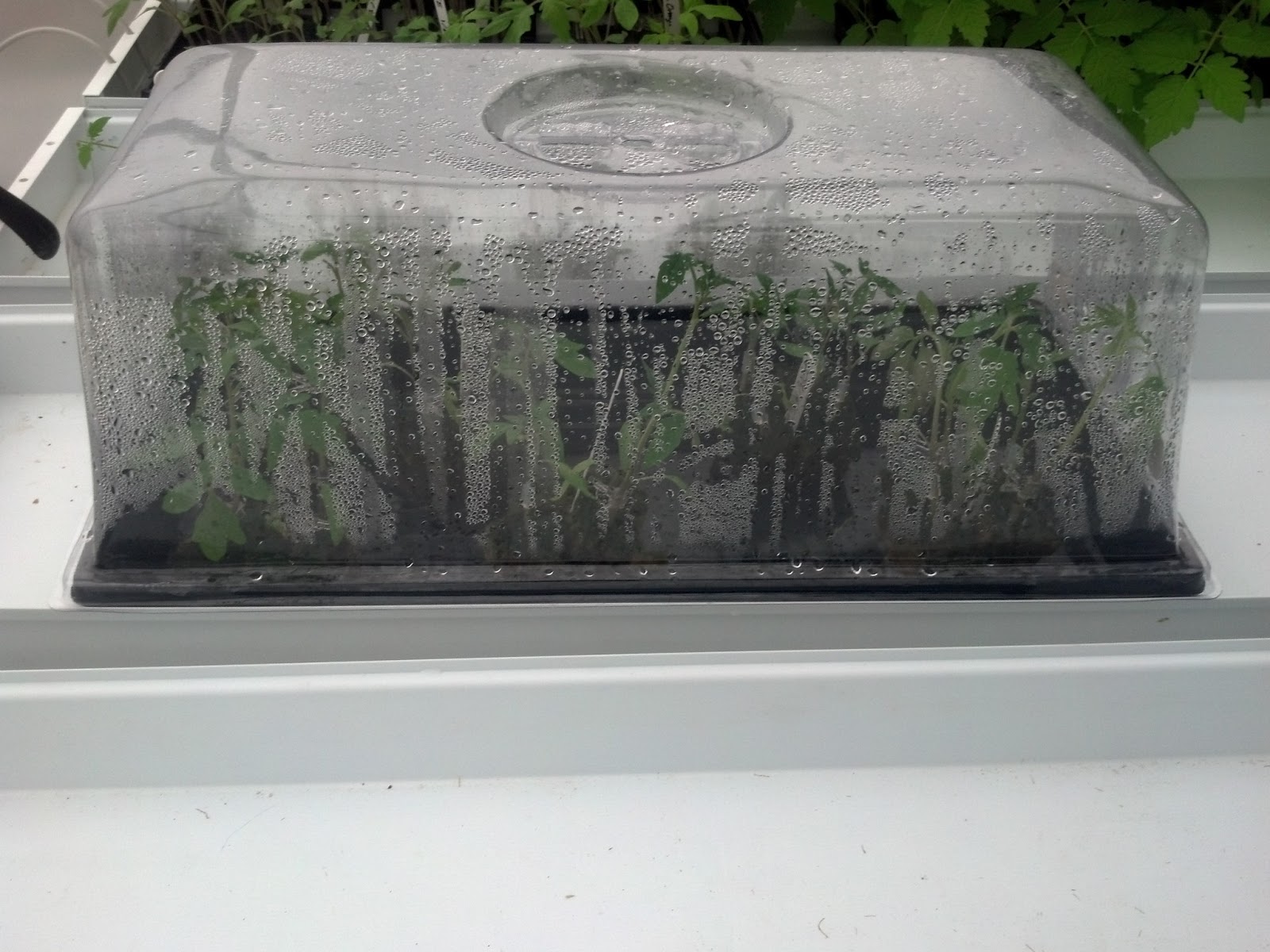 Tomatoes being transitioned after healing (ssen on the right). Some are showing slight wilting, but have adequate grafts to sustain them. A few, though, are wilted down and will not survive. Successfully grafting tomatoes is based on skill in grafting and care in healing- both of which generally improve with practice!