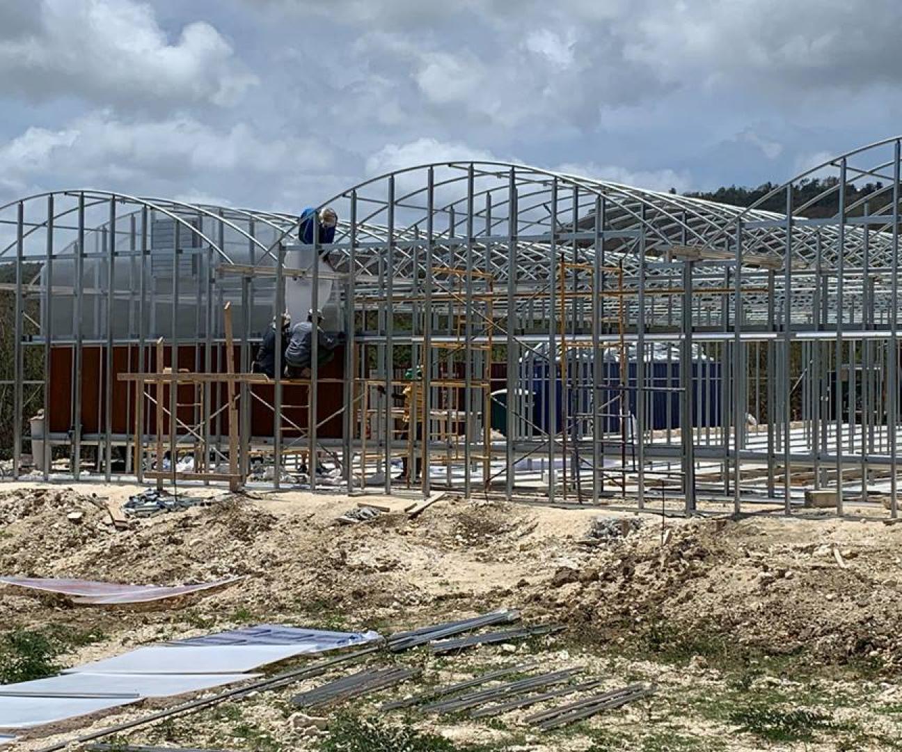 16 bays (approximately 352 ft. wide) equals approximately one acre of production. Our standard greenhouse is 128 ft. long. The column posts, which support the gutter, are spaced 8’ on center.