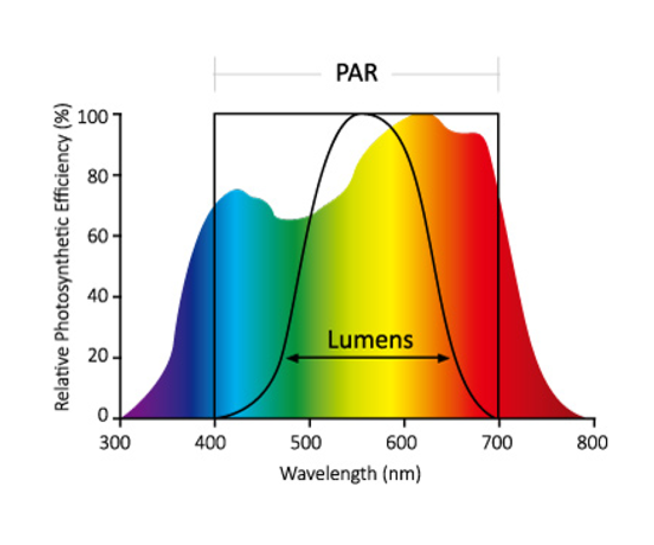 PAR - Photosynthetic Active Radiation, is the wavelength of light in the range of 400 nm to 700 nm that plants are most efficient at performing photosynthesis. This is different than lumens which is the unit traditionally associated with brightness, plants reflect mostly green light but they can efficiently use red and blue lights in photosynthesis.